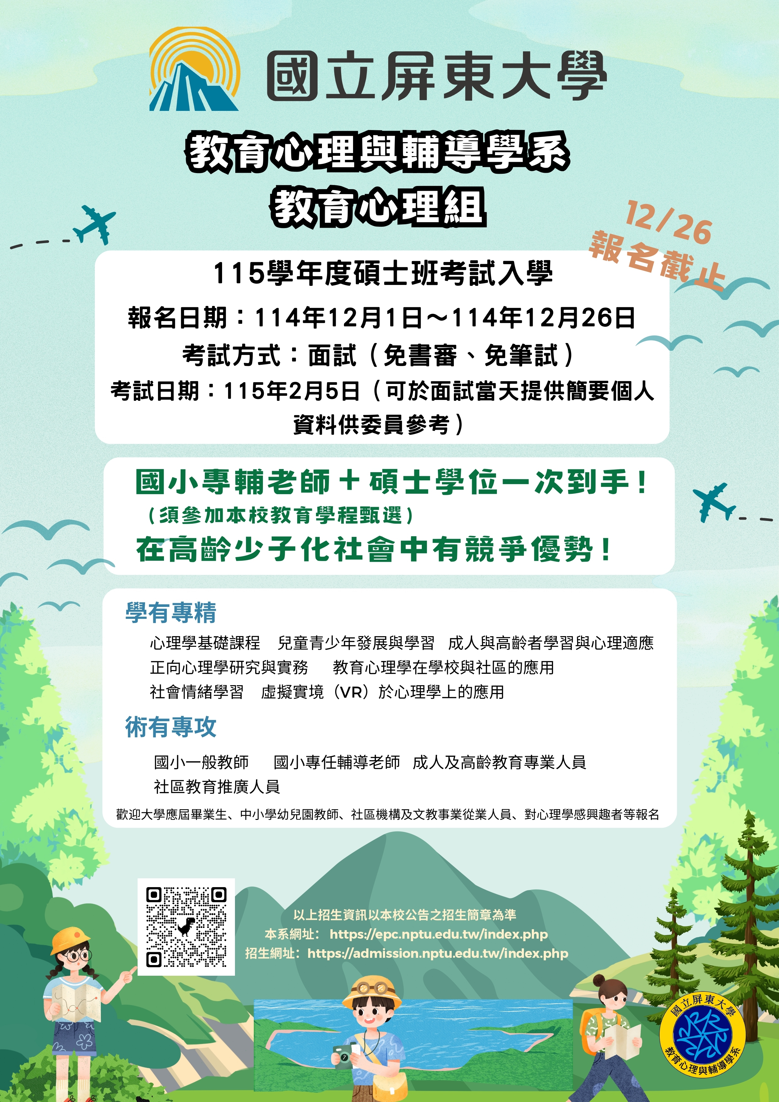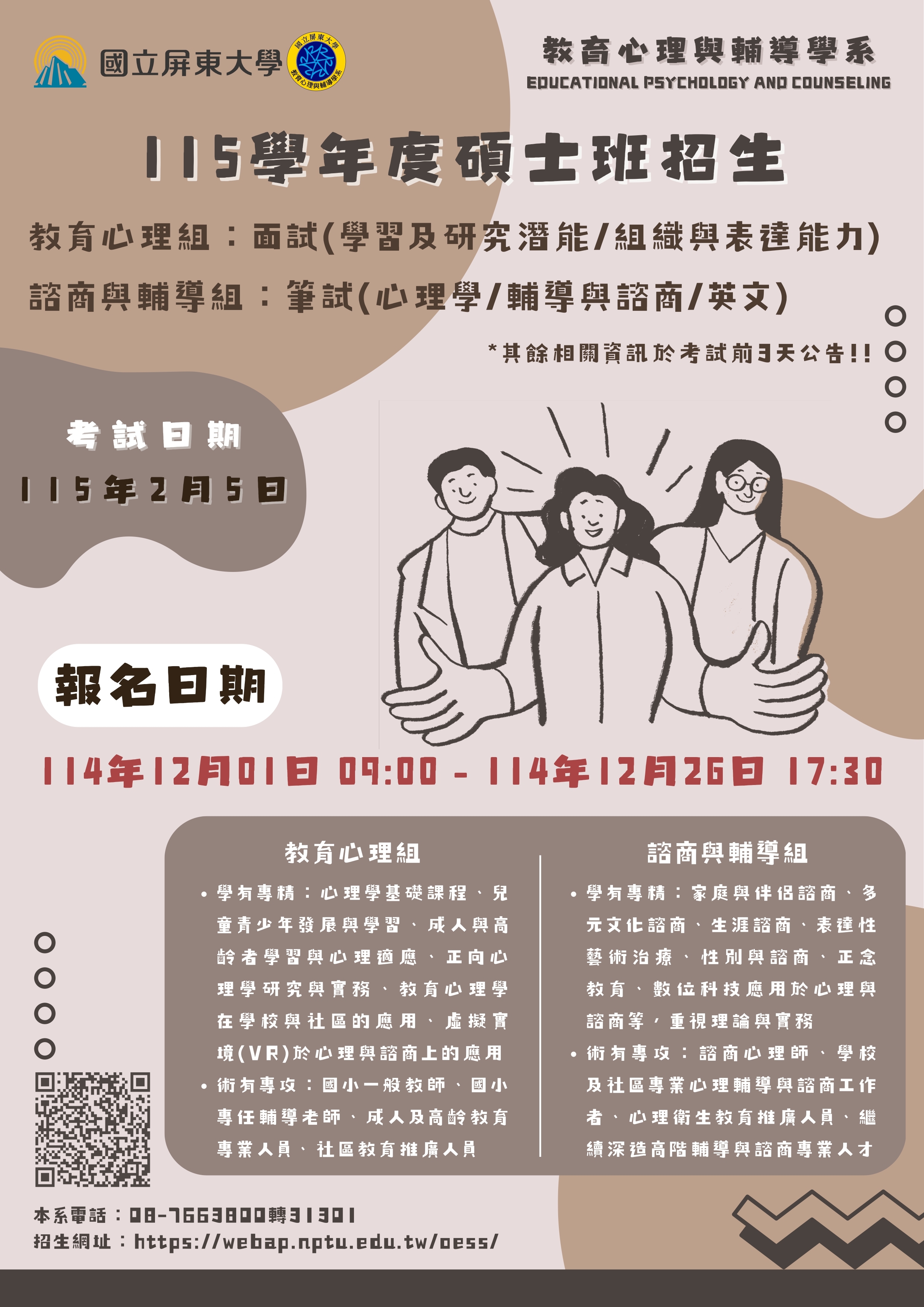 <![CDATA[【招生公告】115學年度教育心理與輔導學系碩士班考試~招生中~歡迎報考!]]>