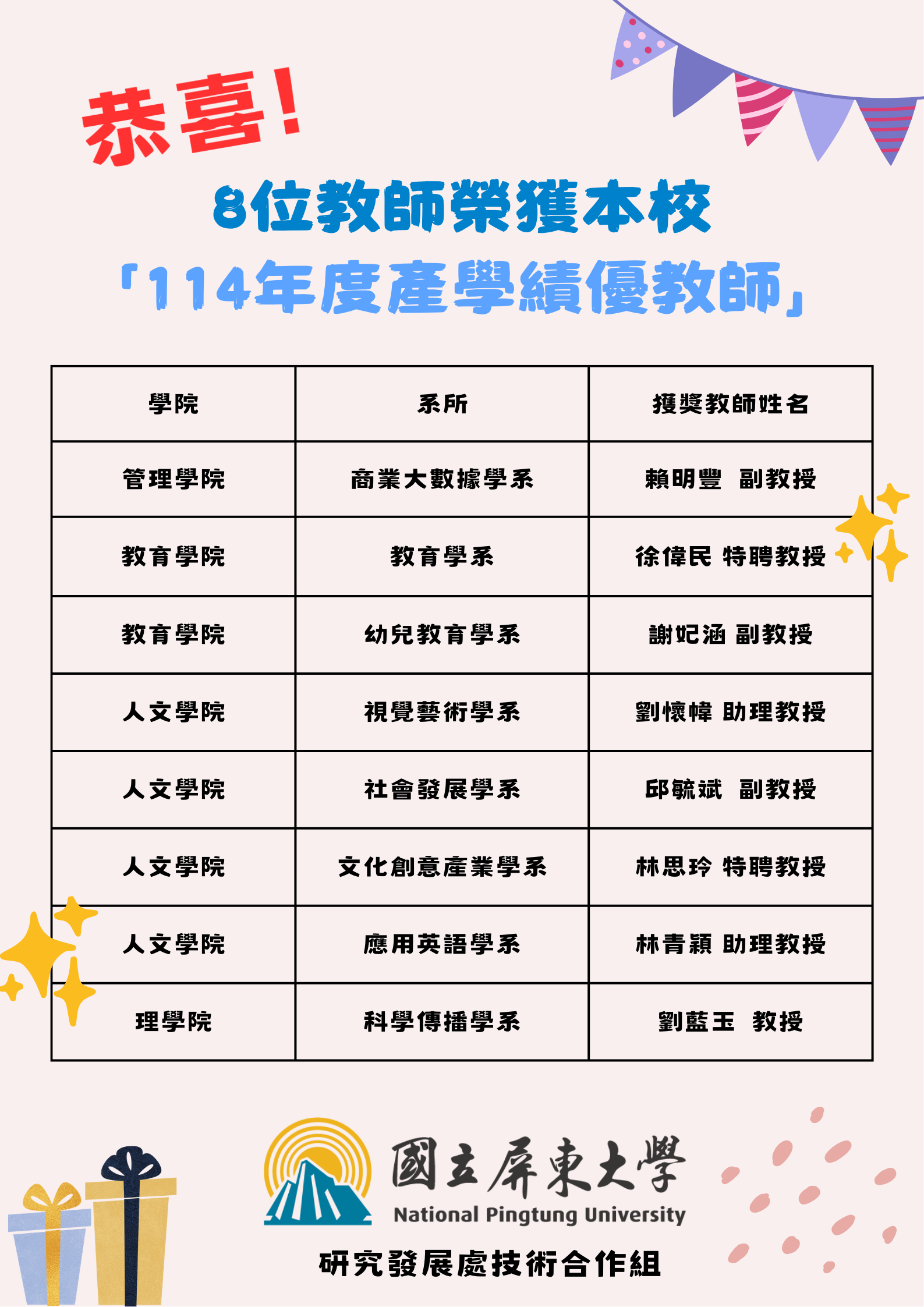 <![CDATA[恭賀!8位教師榮獲本校「114年度產學合作績優教師」]]>