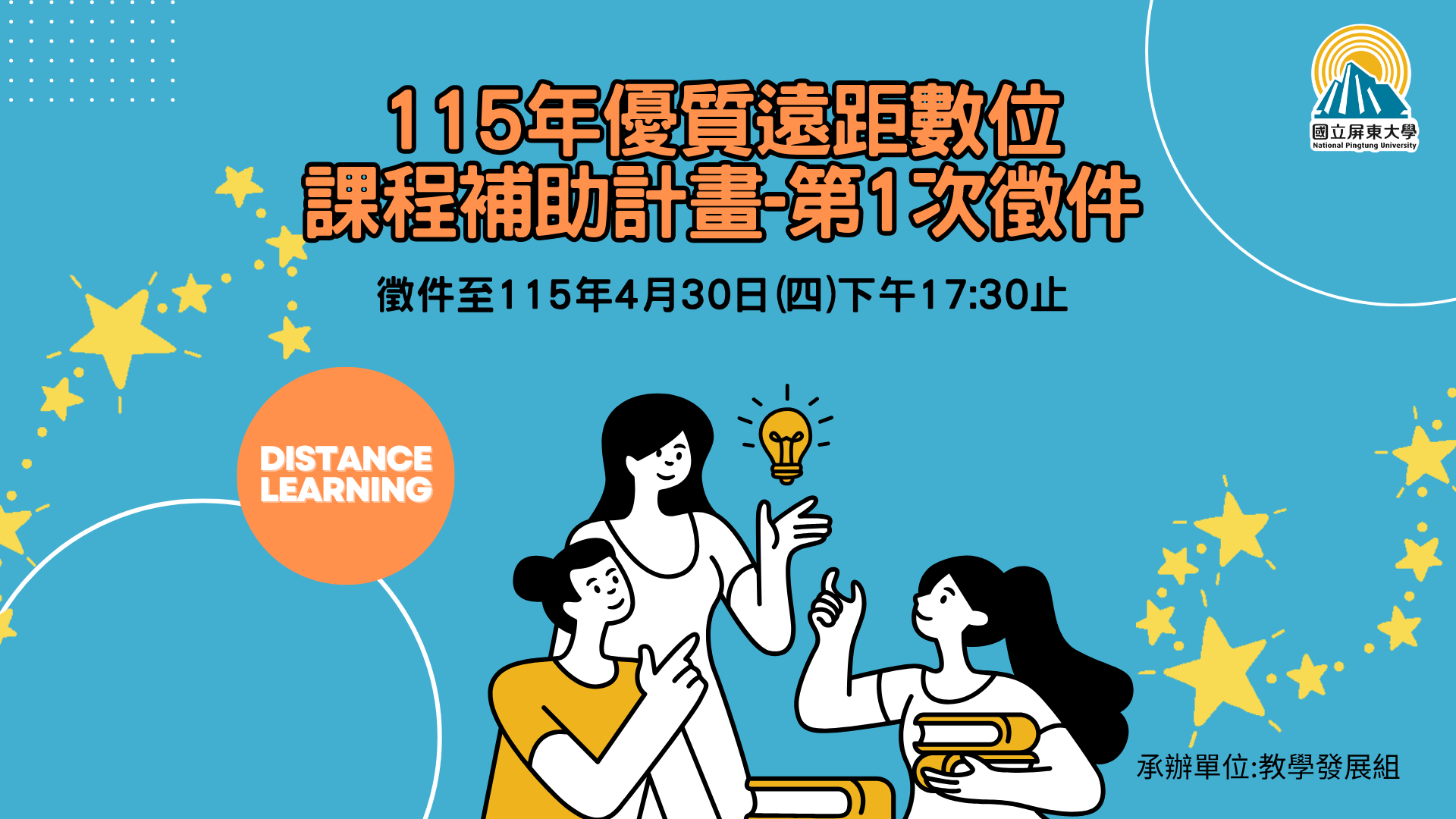 「115年優質遠距數位課程補助計畫-第1次徵件計畫」即日起至115年4月30日(四)下午17:30截止收件